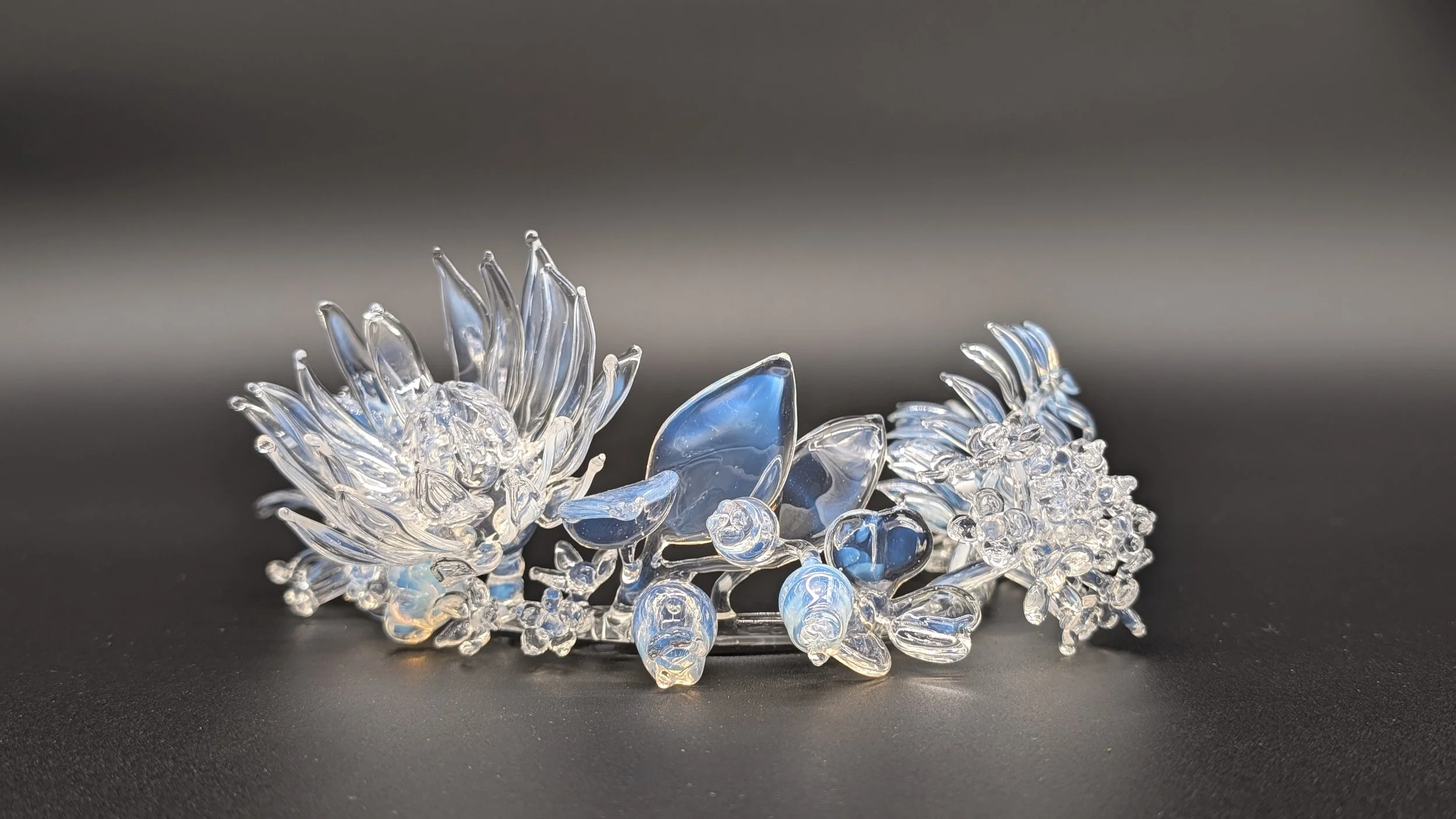 This piece represents plants encountered over visits to Bloedel Reserve on Bainbridge Island for the better part of a year incorporated into a wearable headpiece for Persephone. Mythology would focus on Persephone’s presence or absence driving the seasons and abundance and fallowness, but here fern, salal, sarcococca, and oxalis which form a continuous verdant backdrop at the Reserve are placed alongside showy high-summer lace hydrangea and dahlias, counter to a binary narrative of blooming or barren gardens. Cycles of life and death are alluded to with a memento mori and the fragility of these heavily managed ecosystems becomes visceral for a viewer imagining balancing the tiara on their own head.